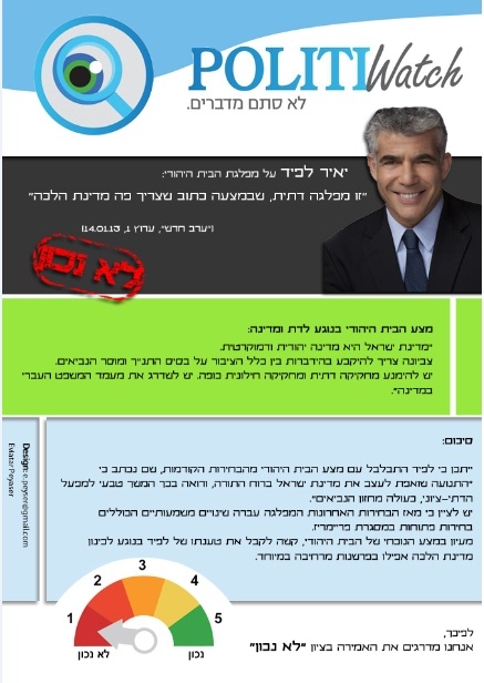 וכך נכתב בתחקיר של העמותה: "ייתכן כי לפיד התבלבל עם מצע הבית היהודי מהבחירות הקודמות שם נכתב כי" התנועה שואפת לעצב את מדינה ישראל ברוח התורה, ורואה בכך המשך טבעי למפעל הדתי-ציוני, כעולה מחזון הנביאים".