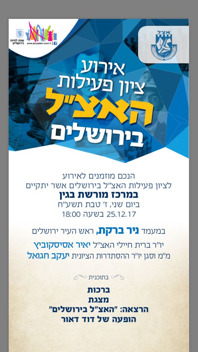 ציון פעילות האצ"ל בירושלים מאת einaraviv 15.11.2017 כללי ליכודניק מזמין אתכם לאירוע מיוחד בהשתתפות ראש עיריית ירושלים, מ"מ יו"ר ההסתדרות הציונית וראש ברית חיילי האצ"ל