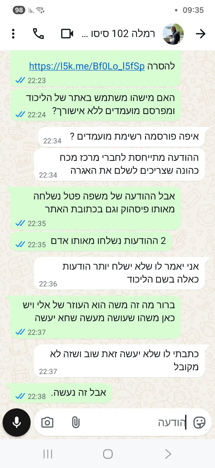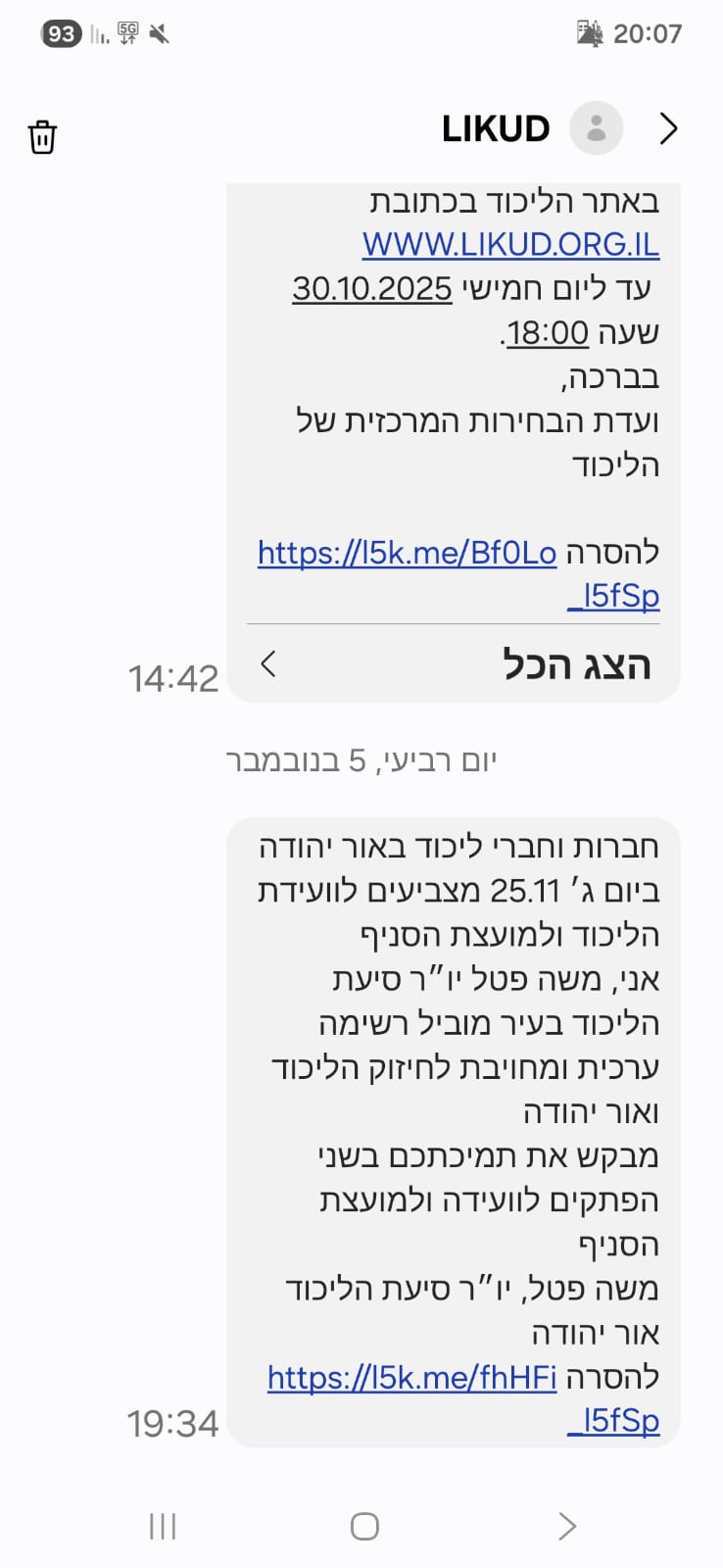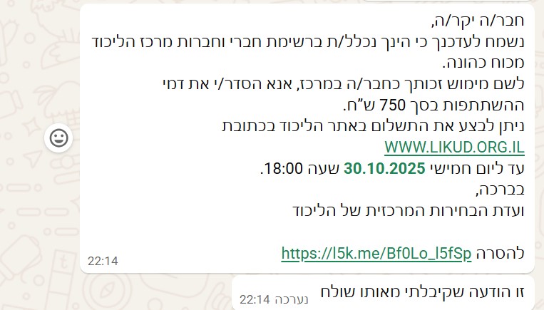 כאמור, מצורפת תכתובת עם מנכ"ל הליכוד בה מאושר כי הודעות בשם הליכוד נשלחו על-ידי גורם הקשור למטה התנועה – וזאת ללא אישור פורמלי.