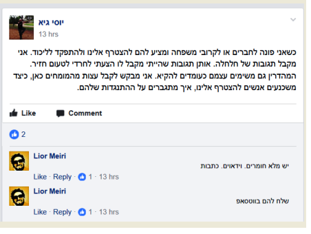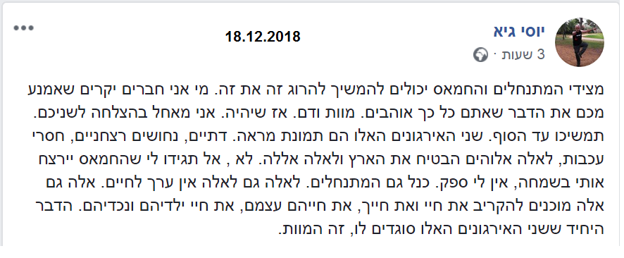 1. אמש פרסם בחור בשם יוסי גיא פוסט זוועתי, בו הוא משווה בין החמאס למתנחלים. הפוסט נפתח באמירה: "מצידי המתנחלים והחמאס יכולים להמשיך להרוג זה את זה...". הפוסט המלא מצורף כצילומסך "יוסי גיא חדש".
