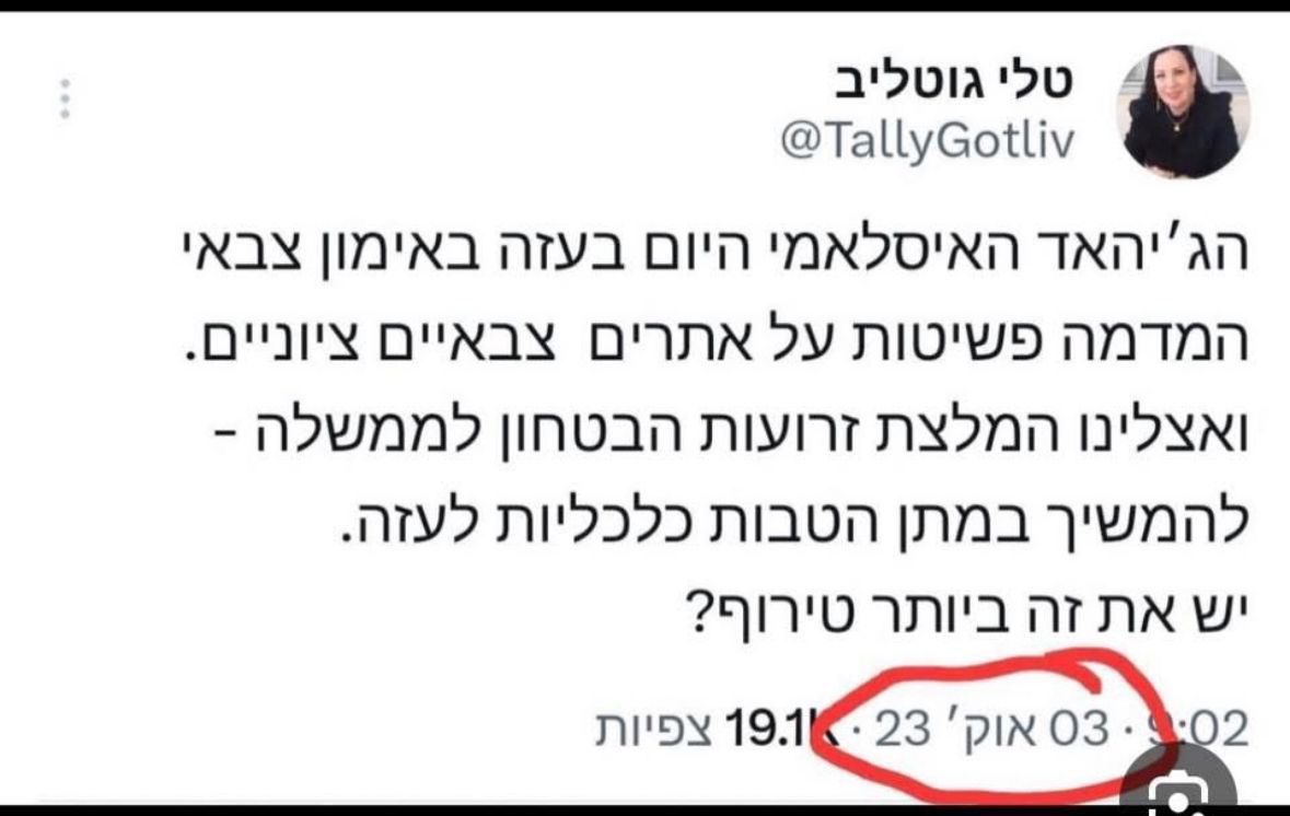 ב־3 באוקטובר 2023, ארבעה ימים בלבד לפני הטבח הנורא בעוטף, ח"כ טלי גוטליב צייצה אזהרה ברורה: